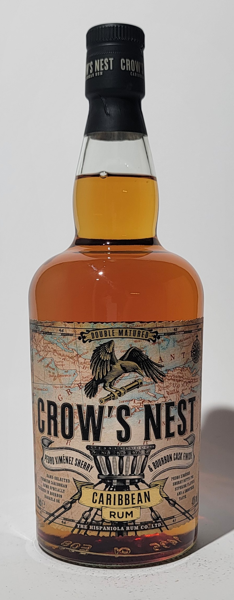 Crow's Nest ist ein doppelt gereifter Fass frischer, karibischer Rum mit speziell ausgewählten Reifrumen aus Jamaika, Barbados, Dominikanische Republik, Venezuela und Trinidad und wurde in Pedro Ximenez Sherry-Butts & Bourbon-Fässern beendet.