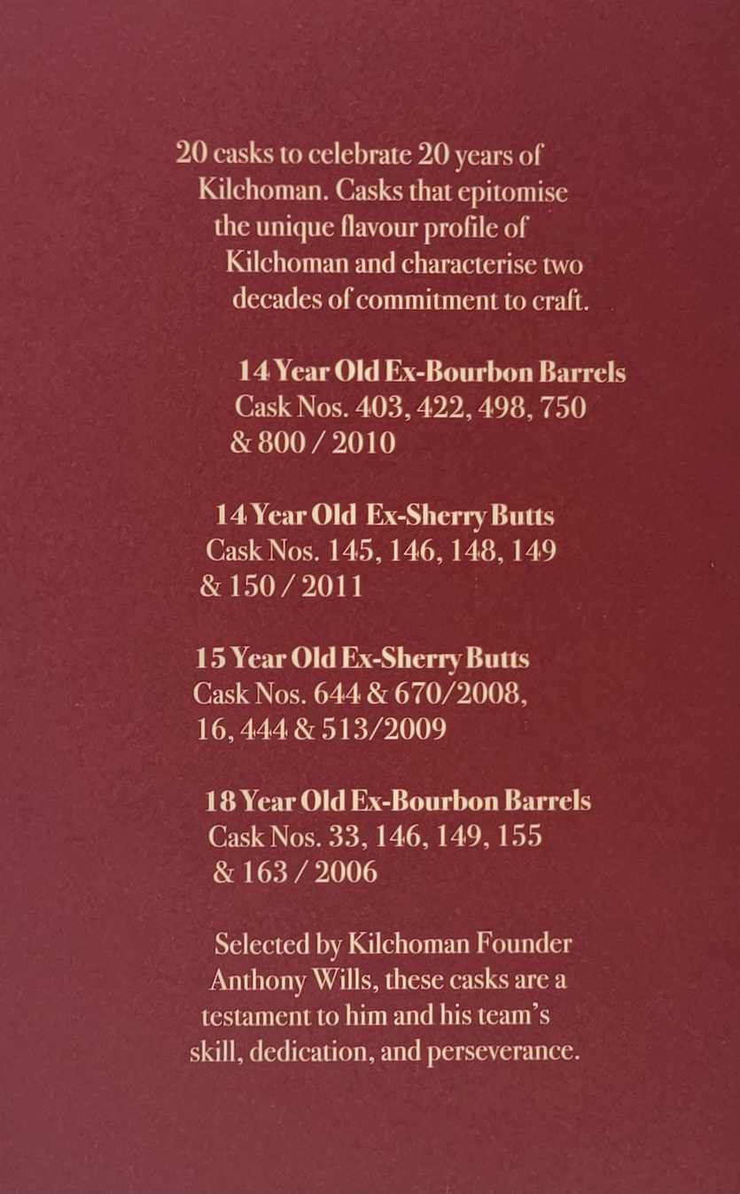 Zur Feier des 20-jährigen Bestehens von Kilchoman wählte Destillerie-Gründer Anthony Wills persönlich fünf handverlesene Ex-Sherry-Butts aus dem Jahr 2011 die diesem dramatischen Single Malt seine einzigartige Persönlichkeit verleihen .