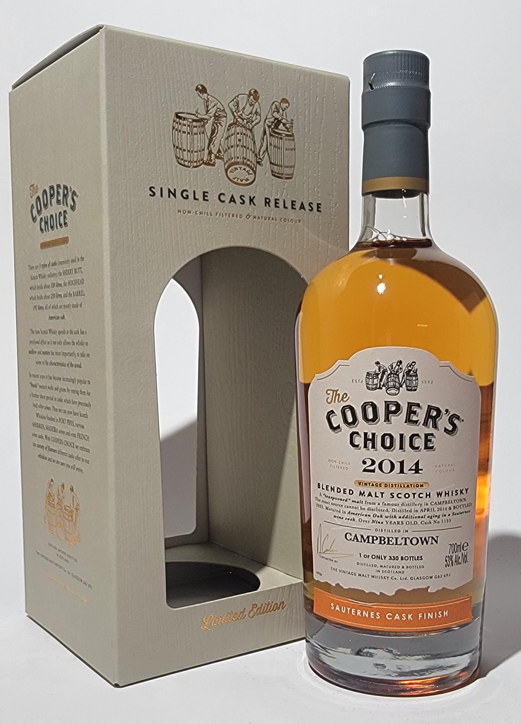 Dieser 'Blended Malt' beinhaltet Whisky aus einer berühmten Destille in Campbeltown, welche nicht genannt werden wollte. Gelagert wurde er in amerikanischen Eichenfässern und Sauternes Weinfässern!