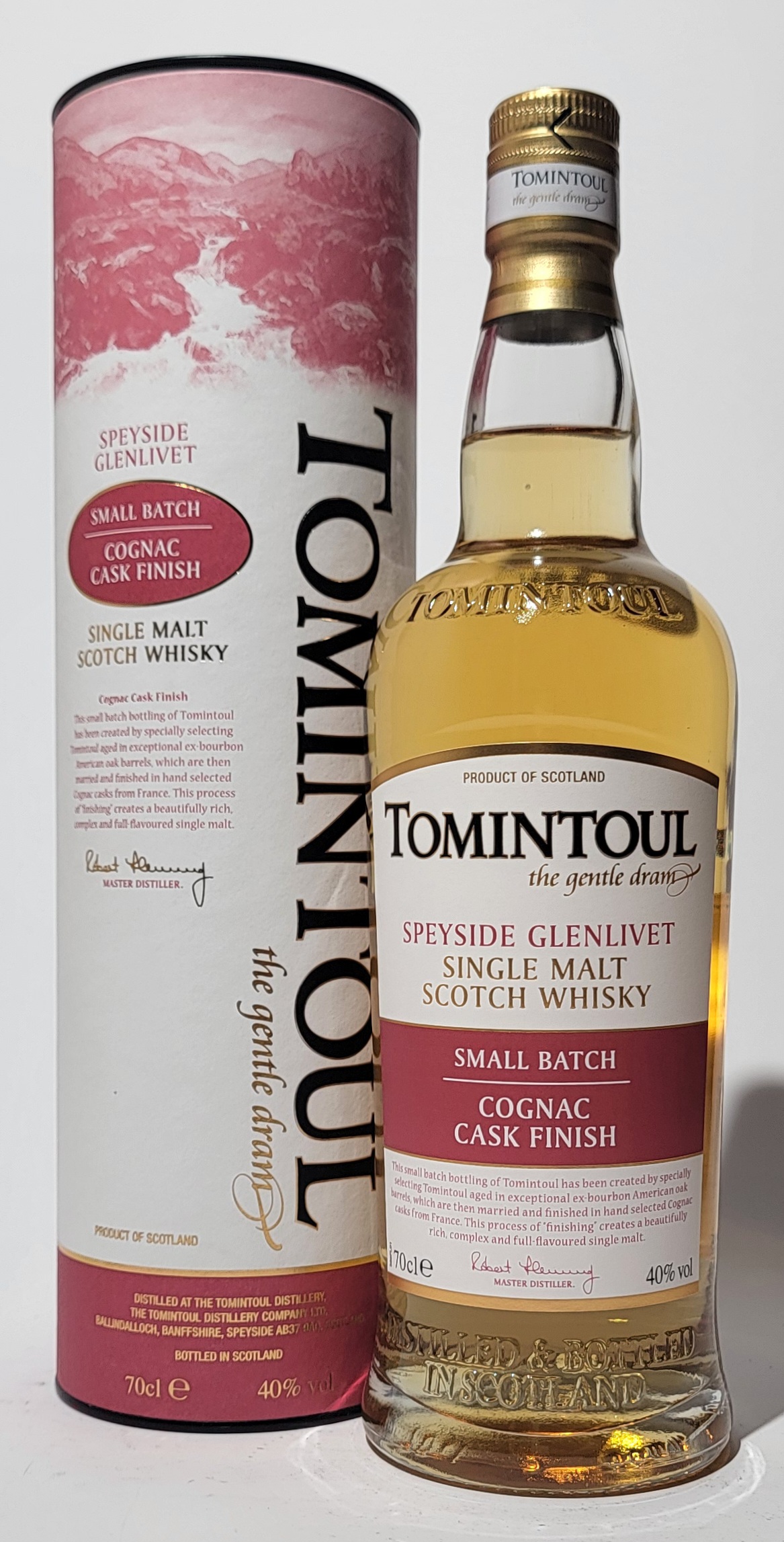 Der Master Distiller, Robert Fleming, hat diese kleine Charge-Abfüllung geschaffen, indem er speziell Tomintoul in außergewöhnlichen Ex-Bourbon-Amerikanischen Eichenfässern ausgewählt hat, die dann verheiratet und in Hand ausgewählte Cognac-Fässer aus Frankreich fertig sind.