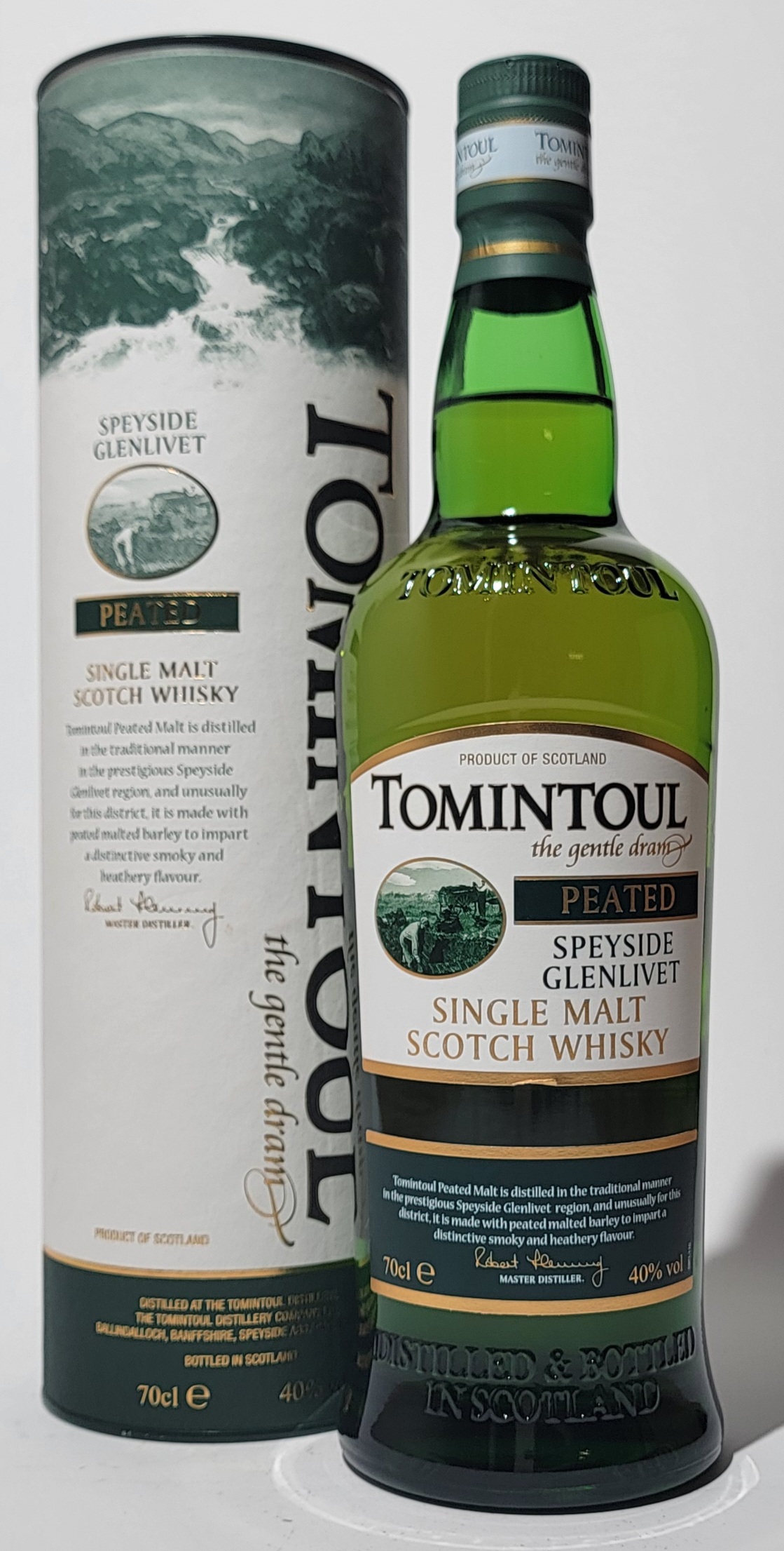 Im Gegensatz zu anderen Tomintoul-Reformen wurde Tomintoul Peated mit peated gemälzter Gerste destilliert, um einen unverwechselbaren rauchigen Geschmack zu vermitteln. Tomintoul Peated, das in den besten amerikanischen Eichen-Bourbonfässern gereift ist, behält die wichtigsten zugänglichen, süßen und fruchtigen Eigenschaften, die mit Tomintoul Single Malts verbunden sind, aber mit dem Zusatz eines subtilen Lagerfeuerrauchs.