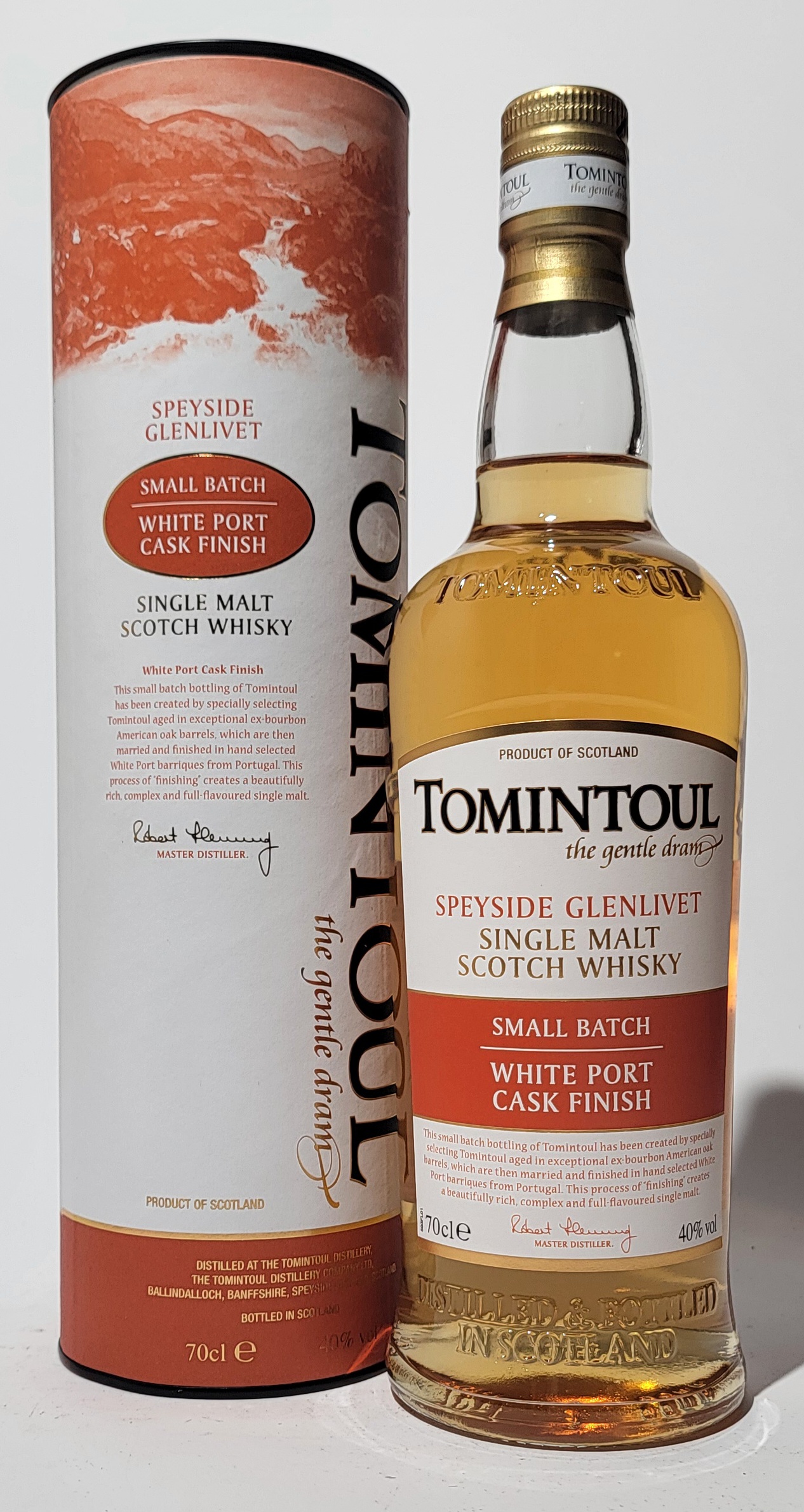 Der Master Distiller, Robert Fleming, kreierte diese kleine Charge-Abfüllung, indem sie speziell Tomintoul im Alter von außergewöhnlichen Ex-Bourbon-Amerikanern auswählte, die dann verheiratet und in der Hand aus ausgewählten White Port Barriques aus Portugal fertig sind.
